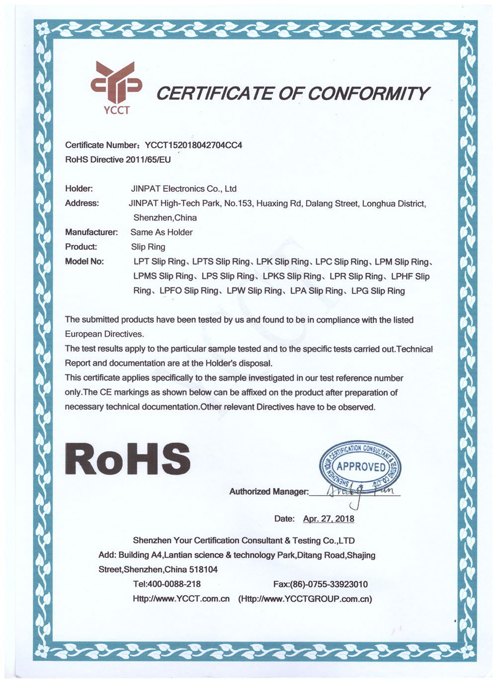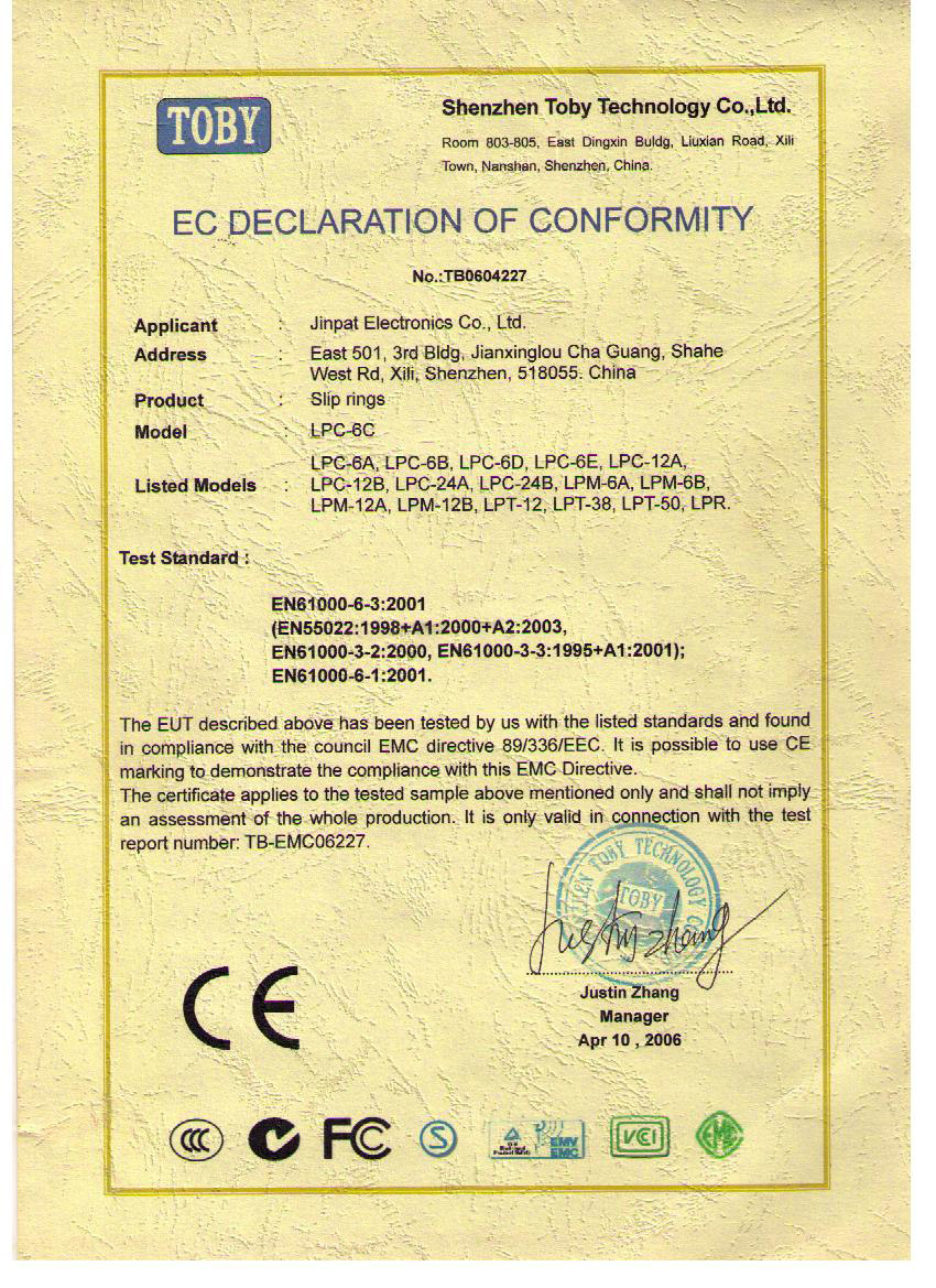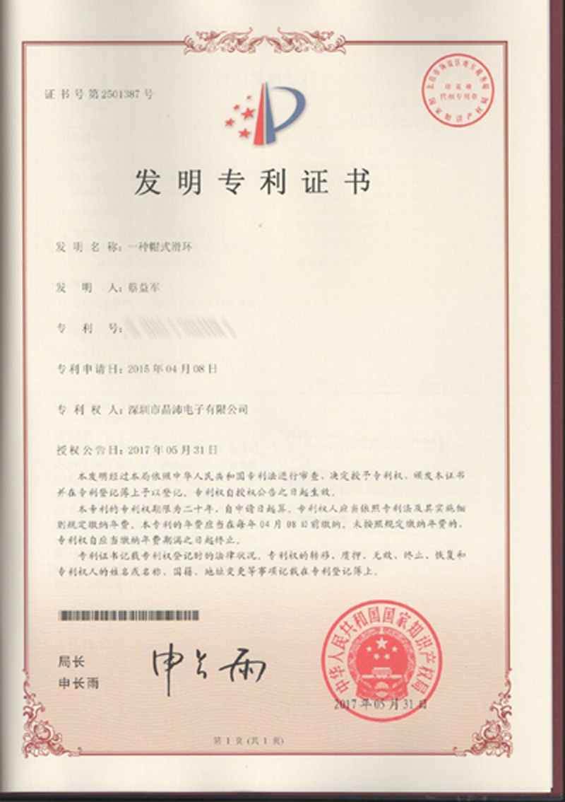 晶沛通過(guò)了歐盟CE認(rèn)證水火不容、FCC認(rèn)證曲终人散、SGS認(rèn)證求知若渴、BV“船級(jí)社”認(rèn)證、防爆認(rèn)證等多項(xiàng)認(rèn)證,生產(chǎn)的導(dǎo)電滑環(huán)都符合RoHS環(huán)保要求,先后被授予“國(guó)家高新技術(shù)企業(yè)”稱(chēng)號(hào),目前已獲得45項(xiàng)專(zhuān)利,其中發(fā)明專(zhuān)利6項(xiàng)。